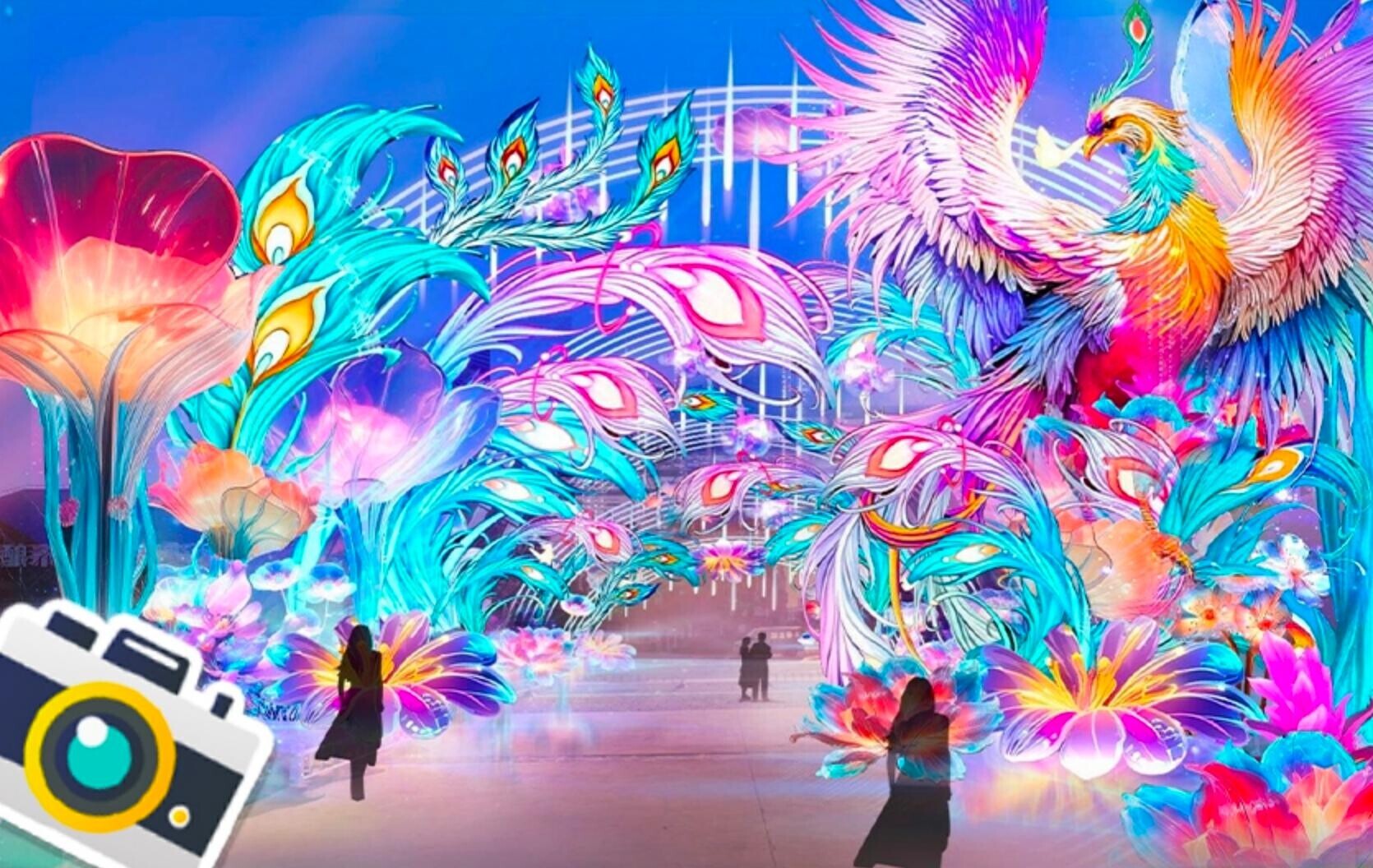 在星光大道北侧通廊东面是《金凤呈祥》灯组,灯组右上方的凤凰栩栩如生,再搭配上缤纷的羽毛和绮丽的花朵,整个灯组十分绚烂夺目。