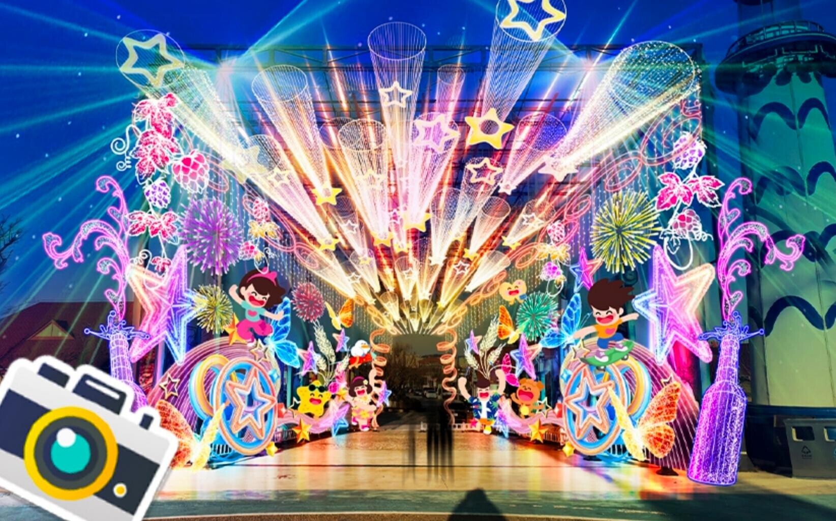 在星光大道南侧通廊东面,是《酒城之光》灯组。其以灵动飘逸的彩带巧妙勾勒出麦穗的饱满、啤酒花的轻盈,仿佛将啤酒酿造的丰收与活力具象化地呈现在眼前。追光闪烁、焰火绚烂的图案交织其中,共同营造出啤酒节热烈奔放、绚丽多姿的迎宾氛围。