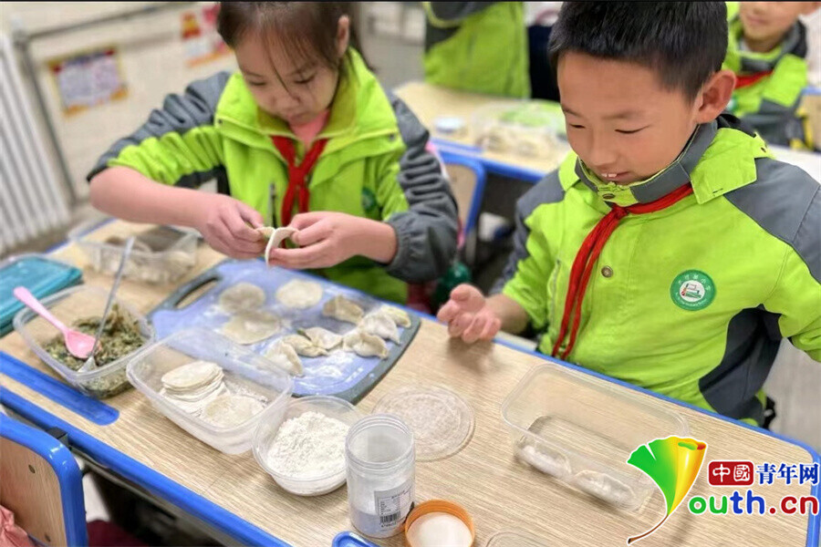 学生体验包饺子。西安高新区第三十二小学供图