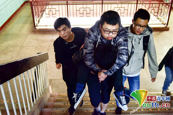 中国青年网北京10月16日电(记者 王龙龙 通讯员 李谌涵 夏汉伟)10月15日上午7点50分,第一节课马上要开始了,湖南科技学院学生赵学成背起同学黎际勤,起身走向五楼的教室。这一幕,自今年9月份开学以来,在湖南科技学院不断地上演着。