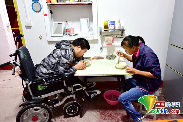 黎际勤与母亲在学校家属楼的宿舍里吃饭。中国青年网通讯员 李谌涵 供图
