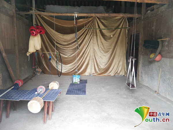 在搭建过程中,父子二人利用了身边的废旧物品。沙袋,是他们用破旧窗帘包着沙子制作的;杠铃,是他们用钢筋水泥组装的;腹肌轮,是他们找来废旧机械的轮子进行组合而成的。他们还用竹子、绳子等做单杠,用铁圈缠上布料固定在墙上做了篮球框。“我们甚至还用废旧的木板,为家里的小妹妹做了一个秋千。”