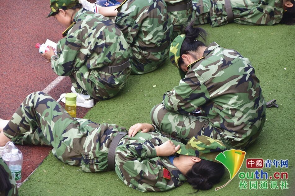 教官说休息的那一刻,再也撑不住酸痛的腿,也忽略了地上的泥土。一位学生直接躺在操场上,累到不想说话。中国青年网通讯员 曹晓宇 提供