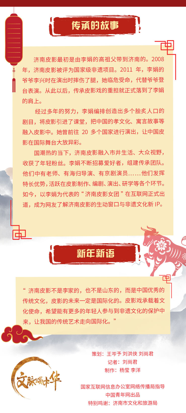 济南皮影是国家级非物质文化遗产,至今已有100多年的历史。以济南皮影戏第五代传人李娟为代表的青年传承人在互联网正式出道,传承、推动皮影文化,为古老技艺注入新的生命力。