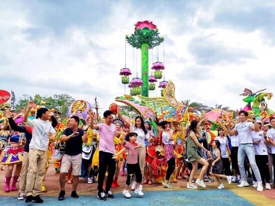 大批游客在广州融创乐园内跟着音节舞动起来,欢乐畅玩