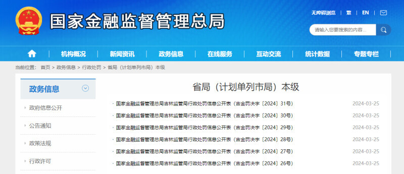 据国家金融监管总局公布信息显示,多项行政处罚决定是由吉林监管局出具的,行政处罚信息公开表(吉金罚决字〔2024〕26号)至(吉金罚决字〔2024〕31号)共计6份,对中华联合财产保险股份有限公司及相关涉事人员作出处罚。
