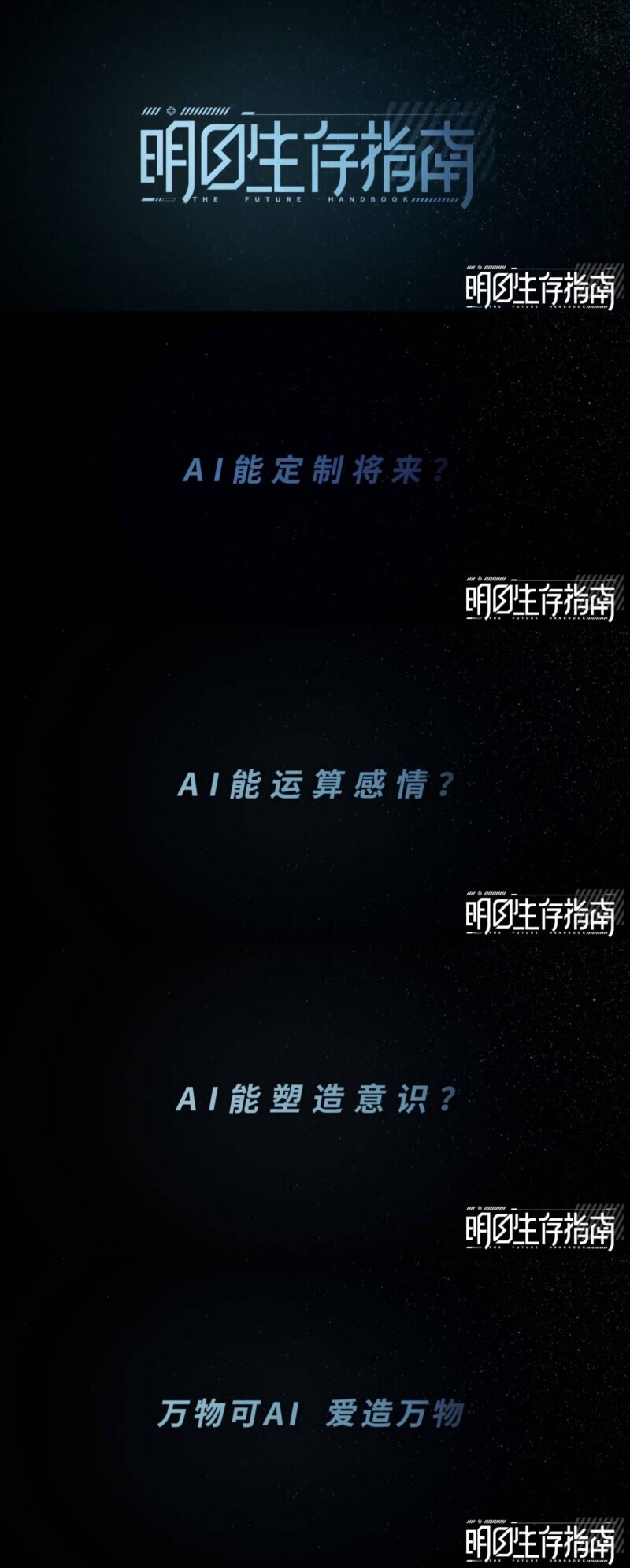 《明日生存指南》围绕AI与爱的主题,讲述了六个关于未来AI世界的故事:《爱之狂想曲》中蔚双(孙千饰)与尚然(郑云龙饰)体验情感荒漠下的AI情感辅助,《记忆通道》中罗风(段奕宏饰)不断找寻在无限循环中掩藏的记忆,《莽撞人》中春元(蒋龙饰)经历被赋予情感的机器人春诚(张弛饰)陪伴的生活,《契阔几何》中常野(郭俊辰饰)与韩潇(苏晓彤饰)寻回永生未来中消失的爱与恋人,《涂色世界》中哲明(姚安娜饰)戴上AI眼镜体验科技加持的更加绮丽的色彩世界,《云清明》中肖杰(杨玏饰)尝试科技手段弥补尽孝的遗憾(以上单片无顺序)。预告片的结尾slogan“万物可AI,爱造万物”,爱与AI不断滚动循环,仿佛也象征着人类情感与AI科技的不断拉扯。