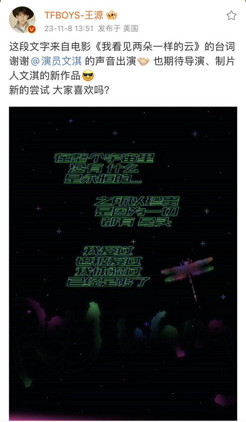 值得一提的是,本次新歌中还暗藏“惊喜”——《我在屋顶等雨也等你》中出现的人声念白为演员文淇的声音,文字也来源于王源与文淇合作电影《我看见两朵一样的云》中的台词。王源温柔清亮的歌声与念白巧妙融合,也为这首新歌增添了不一样的韵味,他也特地发文,感谢对方在新歌中的声音出演。