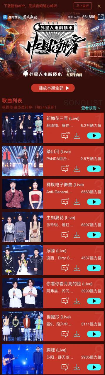 在音乐内容消费上,酷狗一直重视用户洞察,用音乐寻找当代人情感共鸣。针对Z世代对于国风音乐的偏好,酷狗近年来在国风、国潮领域通过音乐与Z时代建立沟通桥梁,并推出国风新语这一国风品牌,打造多首爆款国风歌曲,扶持国风音乐人成长。作为节目出品方,酷狗音乐的这些积累与蓄力,无疑起到了为《中国潮音》保驾护航的作用。
