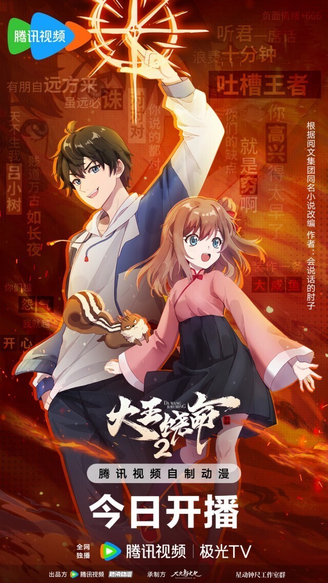 魔王重磅归来,怼人火力全开!网络动画片《大王饶命》第二季将于12月30日起每周六10:00在腾讯视频独家播出。自定档后,官方已发布了第二季动画OP、多支预告PV,吕树和小鱼两人将在新的故事中踏上新的探险旅程,动画将以一贯搞笑的风格给大家带来新年的欢乐。