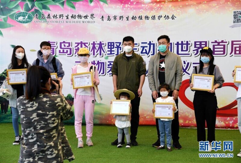 5月1日,部分认养者在领取认养证书后合影留念。当日,青岛森林野生动物世界举行首届动物爱心认养仪式,部分前期认养者领取到了动物世界特意为他们补发的认养证书,以感谢他们对野生动物的关心和帮助。据介绍,青岛森林野生动物世界推出野生动物“云认养”活动后,收到海内外3000多条次认养意向,最终逾500人成功认养,为爱心人士搭建了一个关爱野生动物的平台。 新华社记者 李紫恒 摄