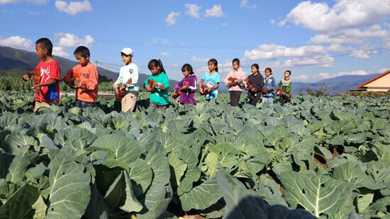一群音乐陪伴计划的受益儿童在路上弹唱的时候,路过一片菜地。(图片由受访者提供)