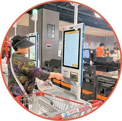 在江西抚州的一家永辉超市,傍晚6点的购物高峰时段,收银区却没有长长的等待队伍。市民李女士推着装满日用品和生鲜的购物车来到自助收银区,将商品摆放在自助收银机的感应台上,商品的数量、价格就自动显示在屏幕上。李女士通过扫码,很快完成支付。“以前高峰时段结账,排队至少要等20分钟。现在这种自助收银就很便捷,即买即走,太方便了。”李女士说。