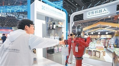 5月22日,浙江人形机器人创新中心工作人员在第四届中国—中东欧国家博览会暨国际消费品博览会“数智中东欧”展区展示一款零售机器人。