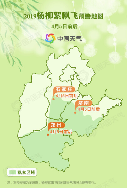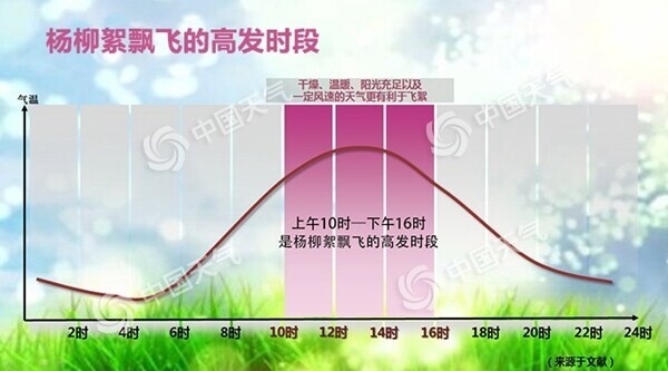 杨柳絮的飘飞时间和气温有着密切的关系。以最先飘絮的毛白杨为例,只有日平均气温>0℃,才是对毛白杨的生长发育有用的温度,将这些超过0℃的数值累加起来,当总和达到480℃,而且日平均气温达到14℃的时候,毛白杨的果实就开始成熟炸裂了,杨絮开始飘飞。之后,柳树及其他杨树,如小叶杨、加拿大杨树等开始飞絮。中国天气网根据未来一段时间的气温和天气现象预报情况,制作了今年杨柳絮飘飞预警地图。