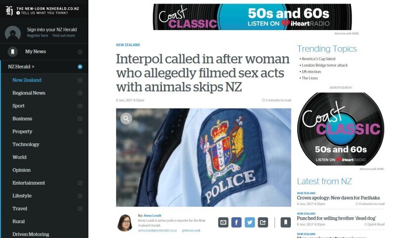 新西兰华人女子出逃中国 涉自拍兽交视频并传播