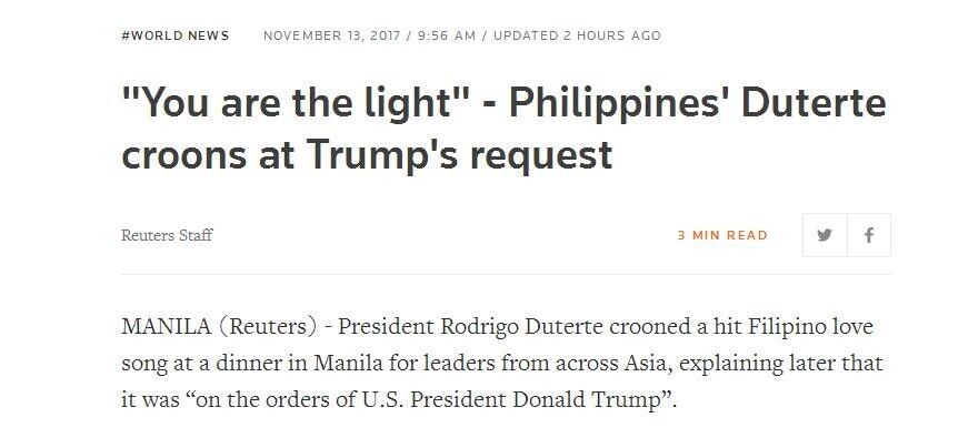 英国路透社13日发表题为“‘你是我的光’,杜特尔特应特朗普要求低声吟唱”报道称,杜特尔特在马尼拉的晚宴上为来自亚洲各地的领导人举行了一场“菲律宾之爱”的歌曲,他后来解释说,这是“美国总统唐纳德特朗普的命令”。