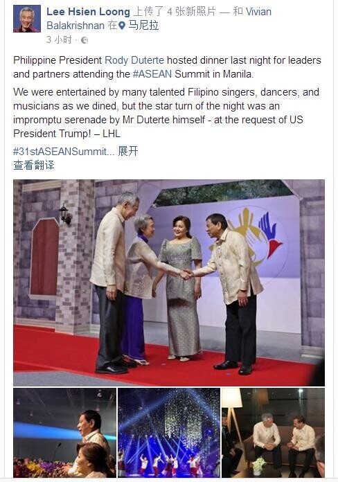 新加坡新传媒8频道13日报道称,在马尼拉的李显龙总理今早(13日)在Facebook贴文表示,昨晚出席由菲律宾总统杜特尔特为东盟峰会领袖举办的晚宴,观赏才华洋溢的菲律宾歌手、舞蹈者和音乐家的演出,不过全晚的压轴,却是即兴上台唱歌的杜特尔特总统。