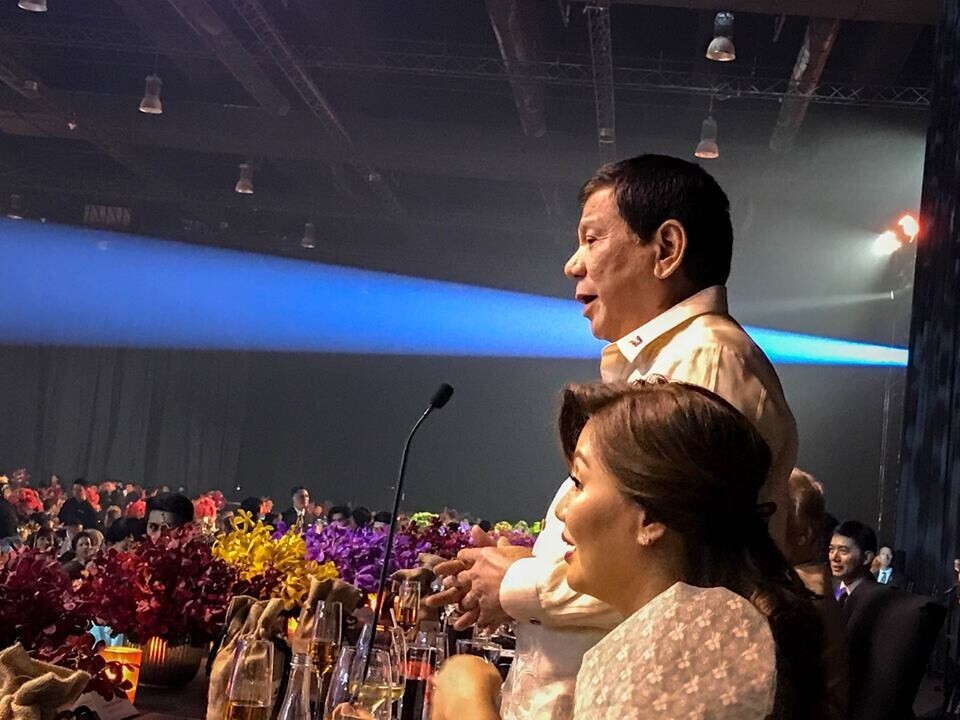 菲律宾当地媒体ABS-CBN报道,菲律宾公造部副部长西梅诺(Karen Jimeno)昨晚也出席在SMX会展中心举行的晚宴,而她所发的推文显示,杜特尔特总统与流行歌曲女歌手Pilita Corales合唱菲律宾情歌《Ikaw》(你)。