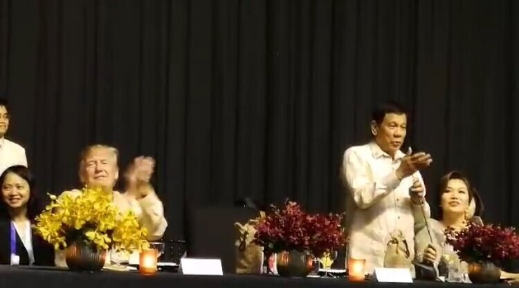 视频显示,杜特尔特总统在合唱完毕后,笑着说:“各位先生女士,我在没有受邀的情况下,而是在美国三军总司令的命令下,与Pilita Corales合唱。” 他的这句话,引起一阵笑声,特朗普也哈哈大笑。