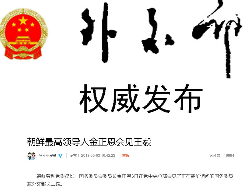 中国青年网北京5月3日电外交部公共外交办公室官方微博刚刚发布消息称,朝鲜劳动党委员长、国务委员会委员长金正恩3日在党中央总部会见了正在朝鲜访问的国务委员兼外交部长王毅。