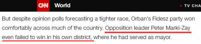 更“杀人诛心”的是,根据美国CNN的报道,与他角逐匈牙利总理的对手、由匈牙利6个反对党派共同组成的反对党联盟的领导人彼得·马尔基-扎伊(Peter Marki-Zay),居然连自己担任市长的选区都输掉了。