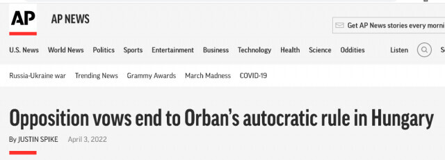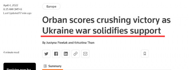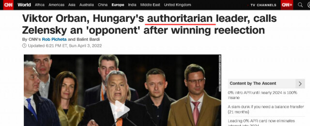 结果,当欧尔班如今以压倒性的优势赢得了此次大选后,气坏了的路透社、CNN、卫报,时代周刊,美联社等一众英美主流媒体,仍不忘在报道此事时给欧尔班扣上了一顶顶诸如“不民主”、“不自由”、“极权专制”还有“亲普京”这种极为负面的政治大帽子,并哀叹说匈牙利在“不民主不自由”的“极权”道路上已经“难以回头”了。