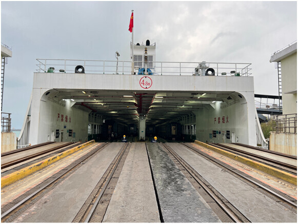 火车顺利进入船舱后,火车栈桥升起。