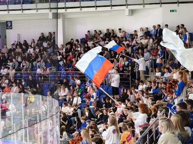6月12日,莫斯科,2023-2024赛季莫斯科大学生冰球联盟决赛在莫斯科中央陆军俱乐部冰球馆举行,图为现场观众挥舞俄罗斯国旗。中青报·中青网记者 赵祺/摄