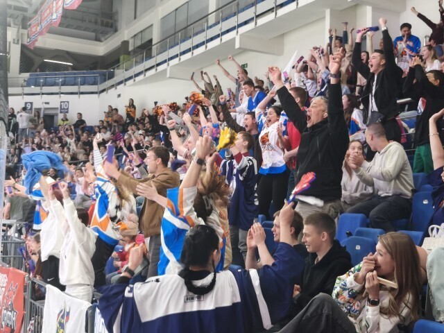 6月12日,莫斯科,2023-2024赛季莫斯科大学生冰球联盟决赛在莫斯科中央陆军俱乐部冰球馆举行,图为莫斯科国立体育学院的球迷在庆祝胜利。中青报·中青网记者 赵祺/摄