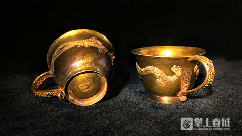 明末清初“平西王府”款龙凤金杯底部打“李永安制”款,龙凤均由掐丝工艺编制成型,然后焊接在铸造杯体上,图案清晰可见,杯柄由两层格丝工艺编制焊接,工艺极其精湛。吴三桂铜像采用云南制佛像的方法制作,加以红漆、金漆描绘。