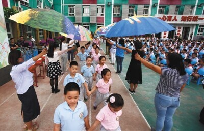 2016年9月1日,海淀区双榆树一小,家长撑起手绘的伞欢迎一年级新生。按照北京市当时规定,凡年满6周岁(2010年8月31日以前出生)的儿童参加信息采集,不满6周岁(2010年8月31日以后出生)的儿童不能采集。资料图片/新京报记者浦峰 摄