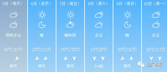 5日夜间到6日多云转晴,早晨有轻雾,东北风2~3级,最低气温7~10℃,最高气温23℃。