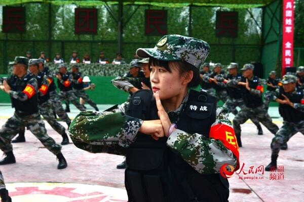 十二师国资(集团)公司基干民兵营特战连女民兵正在做擒敌拳动作。李晓啸 摄