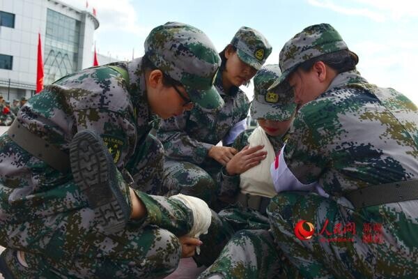 十二师国资(集团)公司普通民兵营二连演示战地救护。李晓啸 摄