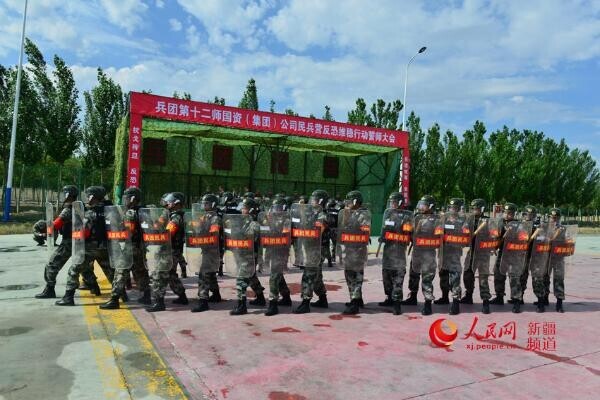 4日上午,新疆生产建设兵团第十二师国资(集团)公司民兵营反恐维稳行动誓师大会在新疆希望爱登堡电梯有限公司民兵训练基地举行。李晓啸 摄