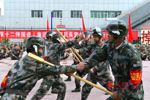 十二师国资(集团)公司基干民兵营一连演示大头棒的使用。李晓啸 摄