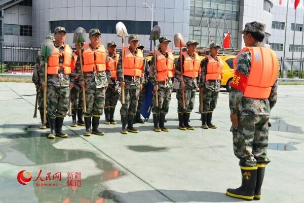 十二师国资(集团)公司民兵展示抗洪抢险救灾人员及装备。李晓啸 摄