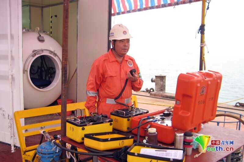 钟海锋正通过潜水电话指挥潜水员作业。詹欣金 摄