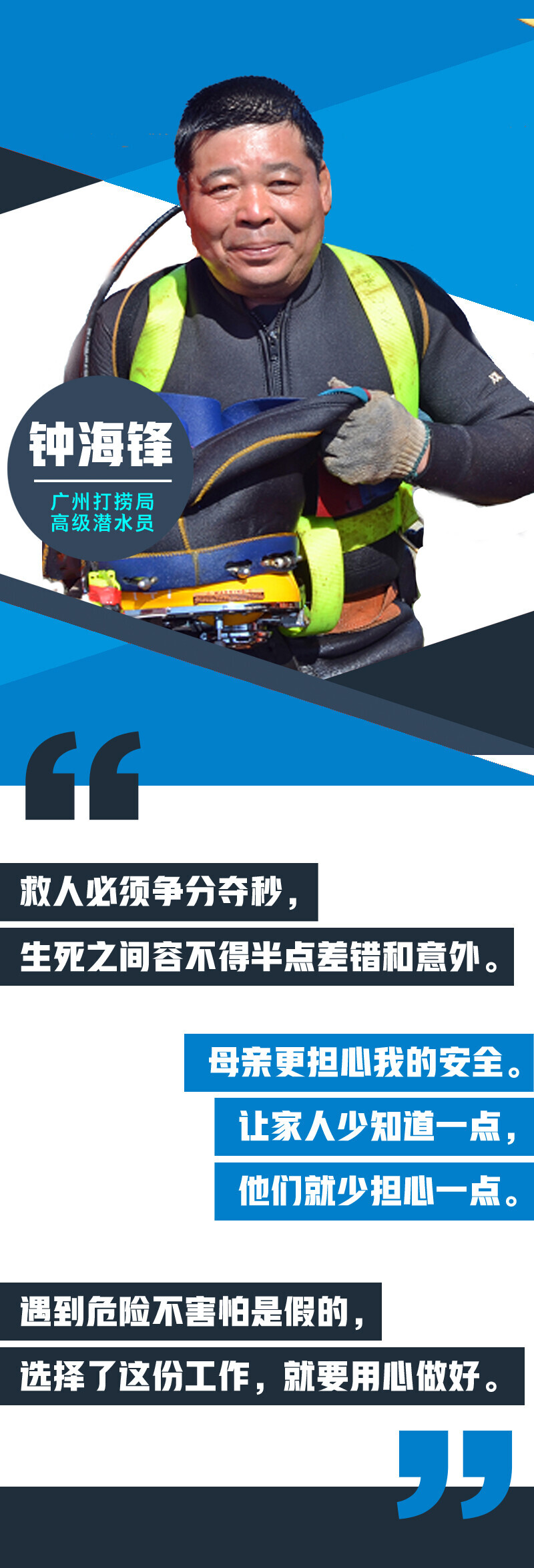 钟海锋是广州打捞局高级潜水员。28年间,救人和打捞工作布满了他的职业履历。在他的手中,命悬一线的生命重获生机,千吨级的沉船重见天日。