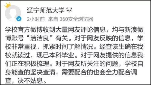 而她的母校,她口中的“野鸡大学”辽宁师范大学也发布微博,表示正在调查。