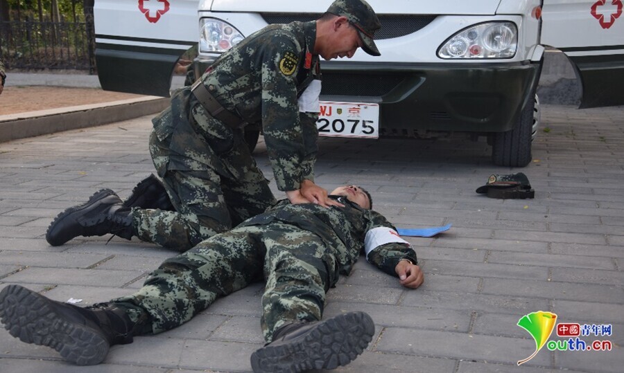 “伤员头部流血不止、呼吸苦难,立即进行抢救。”在救护考场上,考官们“百般刁难”,但参赛选手不慌不忙,现场展开止血、包扎、固定、心脏按压,争分夺秒,一气呵成,顺利完成抢救任务。