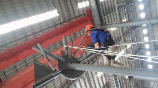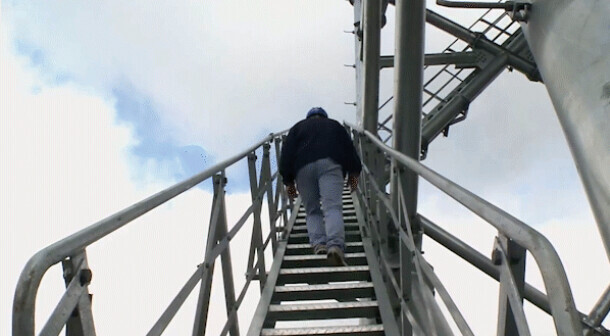这是2014年,在“天眼”反射面吊装之前,南仁东进行的“小飞人”试验。这项试验要把人吊起来,送到6米高的试验节点,南仁东坚持第一个上。
