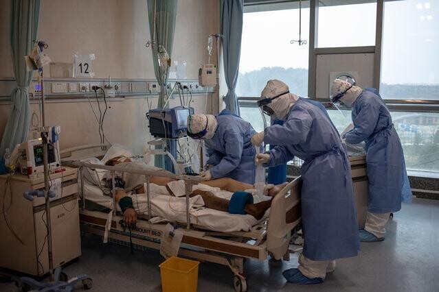2月26日,湖北省武汉市华中科技大学同济医院光谷院区,由该院血液净化中心护士长鄢建军(右)带队的“护肾小队”在园区ICU病房中,为一名新冠肺炎病人做血液透析前的准备。该院所收治的新冠肺炎病人均为重症或危重症患者,当日,他们为10名病人进行了血液透析操作。中青报·中青网记者 李隽辉/摄