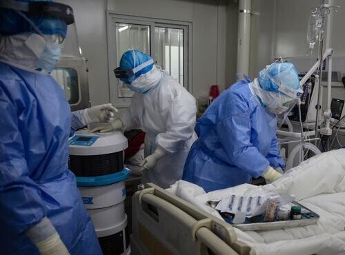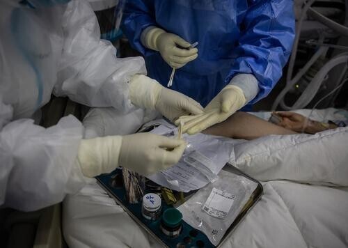 2月21日,武汉火神山医院感染八科一区,医护人员准备为一名新冠肺炎患者采动脉血样做血气检查。中青报·中青网记者 李峥苨/摄