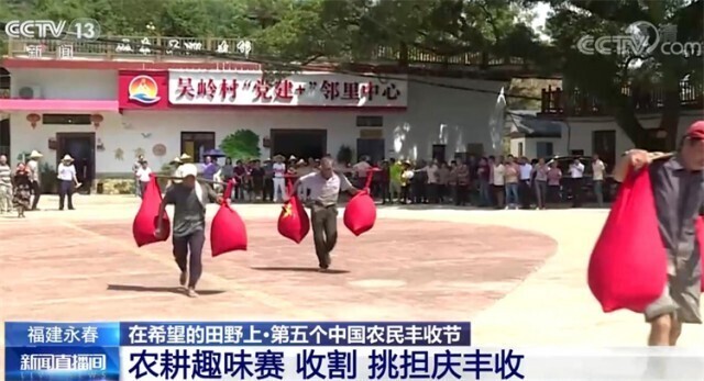 9月22日,在福建泉州永春县湖洋镇吴岭村,一场农耕趣味赛火热进行。比赛一开始,四组参赛队伍就迅速开割,选手们分工协作、配合默契,现场一片紧张激烈的收割、脱粒的景象。随后,挑担接力赛热闹开始,每支队伍负重100斤,以接力的方式往返进行,大家快速挑担奔跑,现场观众助威声此起彼伏,大家以这样趣味的农耕比赛庆祝丰收。