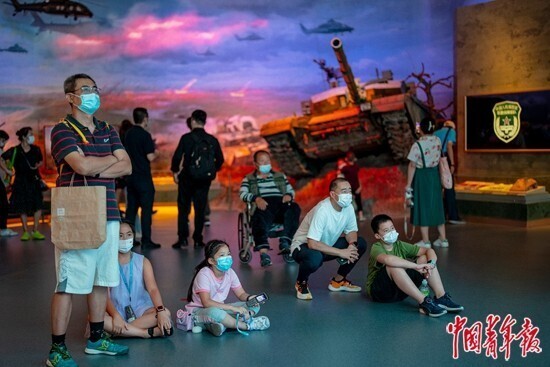 8月30日下午,中国人民革命军事博物馆,“领航强军向复兴——新时代国防和军队建设成就展”现场,参观的观众席地而坐,观看视频。