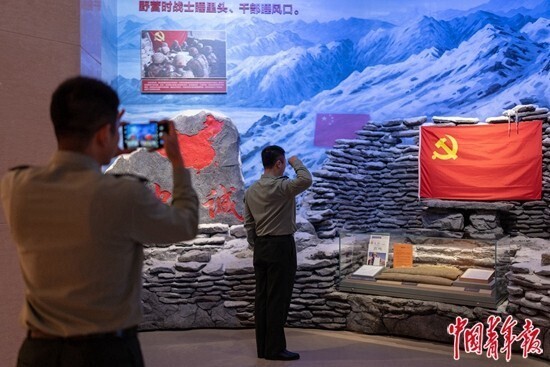 站在“战斗一线的坚强堡垒”场景前,国防大学军事文化学院学员钟美琪同样感到“热血沸腾”。这个年轻的姑娘出生于2001年,2019年高中一毕业便报名参军,来到她从小心心念念的军营,成为一名特种兵,后来又作为文艺轻骑兵跟随部队走上西藏边防线。看到展墙上悬挂着来自边防一线的照片,镜头里的官兵们爬冰卧雪,巡逻在祖国的边防线上,这些图片让钟美琪想起自己在高原驻训的日子,“当时缺氧觉得很痛苦,但现在感觉特别自豪”。