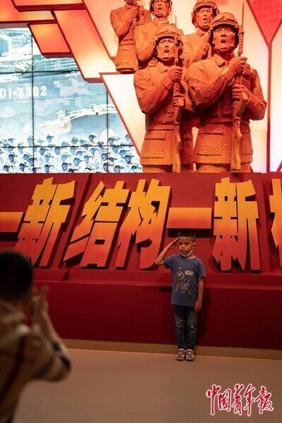 8月30日下午,中国人民革命军事博物馆,一名在“领航强军向复兴——新时代国防和军队建设成就展”现场参观的小朋友在雕塑前敬礼合影。