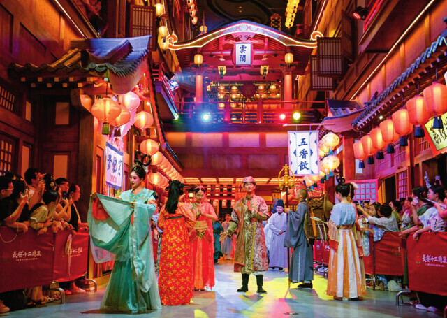 游客在西安长安十二时辰主题街区观看唐风演艺《万邦来朝》( 2023 年 8 月 2 日摄) 邹竞一摄 / 本刊